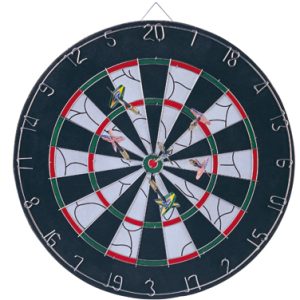 Características Técnicas: – Alvo dupla face de madeira nobre, revestida de camurça. – Numeraraçao galvanizada e dardos em aço inox e penas em abs. Medidas: – Diâmetro: 45cm. – Espessura: 4cm.