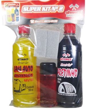 O kit contém: * 01 unidade de Lava Auto 500ml * 01 unidade de Pretinho 500ml * 01 unidade de Flanela 30X30cm * 01 unidade de Silicone 100ml * 02 unidades de Esponja 70X70X30mm